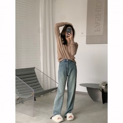 复古浅蓝开叉牛仔裤女春秋2023年新款高腰显瘦宽松休闲拖地直筒裤