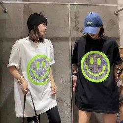 笑脸烫钻T恤女中长款2022春装新款圆领宽松短袖上衣