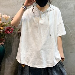 大领口竹节棉t恤女短袖宽松休闲胖mm200斤纯色连帽薄款