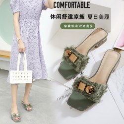 2022新款网红粗跟一字拖鞋女中跟方头仙女懒人拖鞋潮