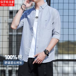 男式七分袖衬衣简约全棉男士中袖衬衫落肩宽松情侣