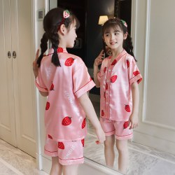 夏季薄款仿真丝儿童睡衣短袖开衫V领卡通中大童仿冰丝空调家居服