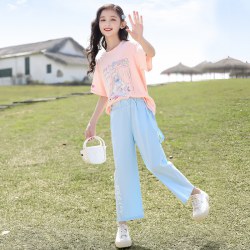 女童夏季套装糖果色卡通运动装2022新款韩版儿童夏装短袖阔腿裤