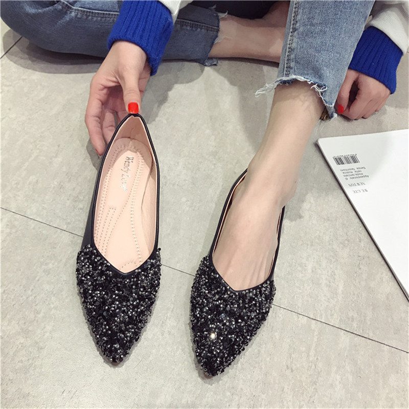 韩版水钻亮片尖头单鞋女平底瓢鞋浅口软底奶奶鞋平跟欧美大码女鞋