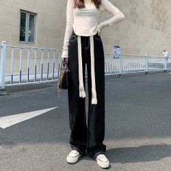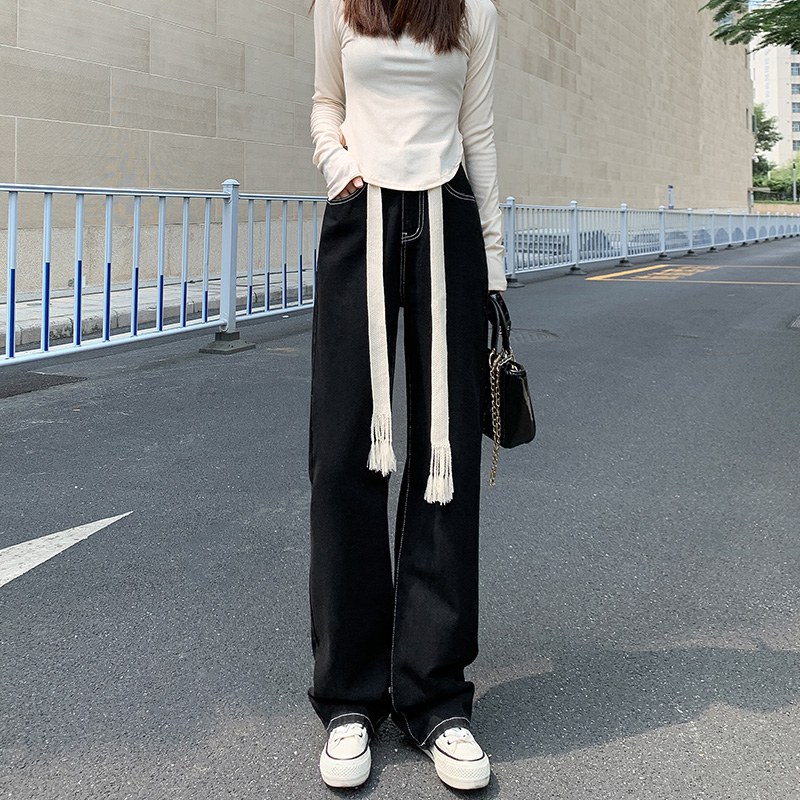 【预售】2021爆款抽绳阔腿直筒显瘦高腰黑色牛仔长裤