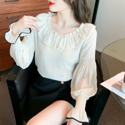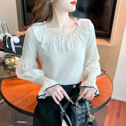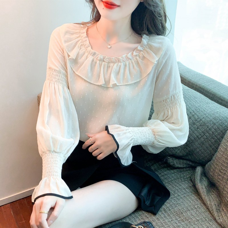 2022春季新款超仙雪纺衫蕾丝圆领时尚网纱灯笼袖上衣