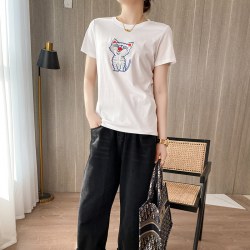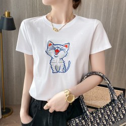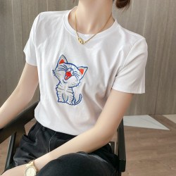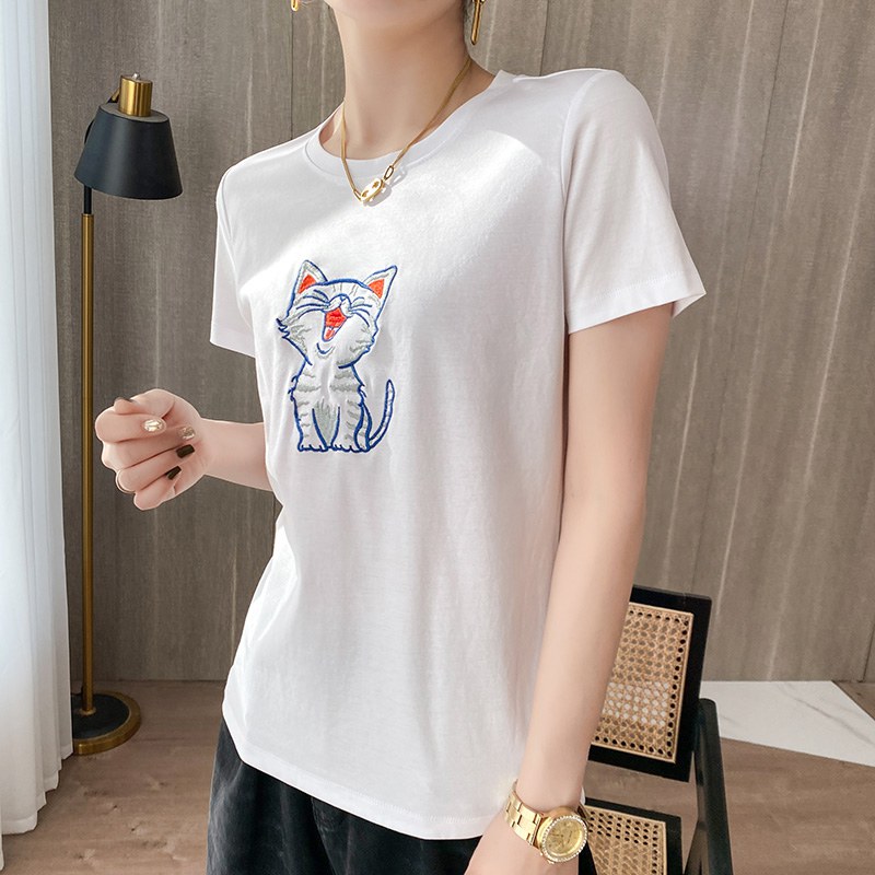 白色丝光棉短袖T恤女装刺绣小猫半袖2022夏季新款