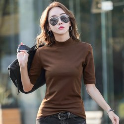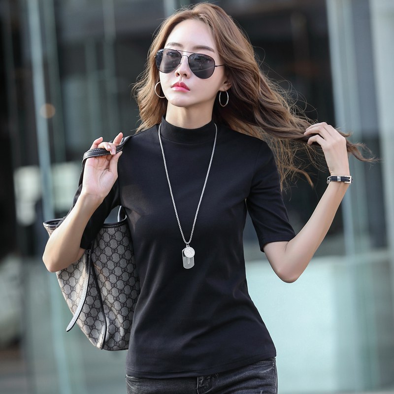 中袖t恤女棉质半高领打底衫新款春秋装韩版