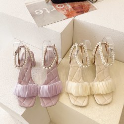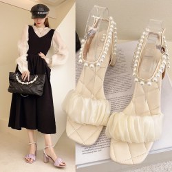 2022新款网红方头珍珠配裙子气质仙女一字扣高跟鞋