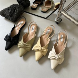 2022年新款夏季蝴蝶结尖头粗跟法式低跟浅口日常小众
