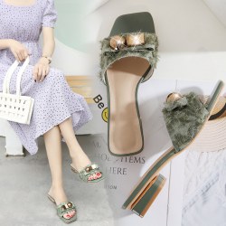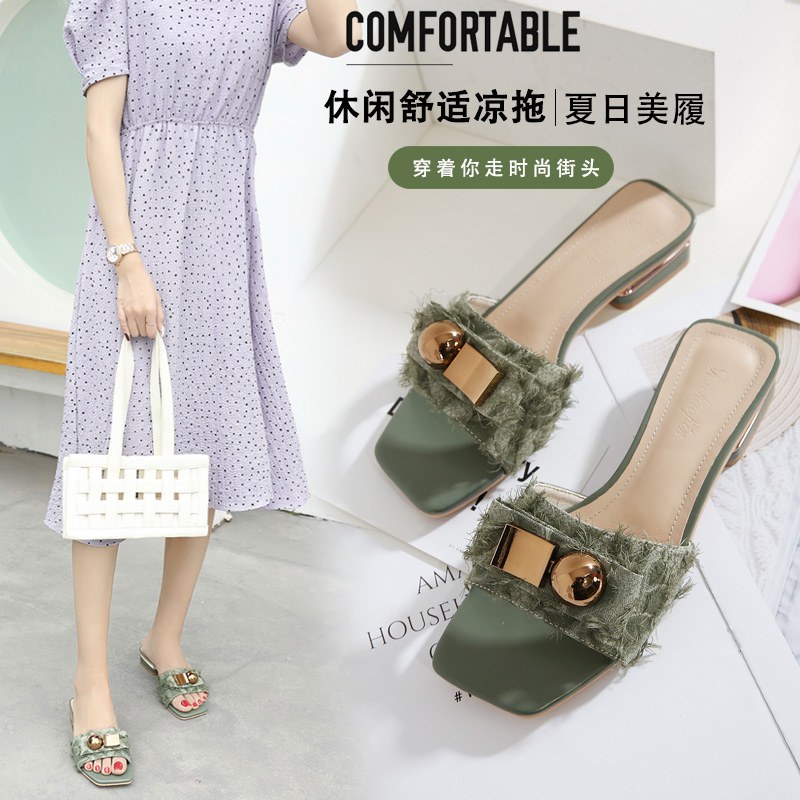 2022新款网红粗跟一字拖鞋女中跟方头仙女懒人拖鞋潮