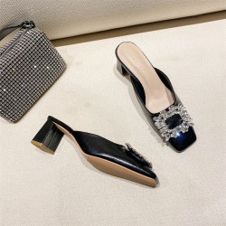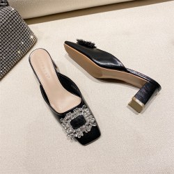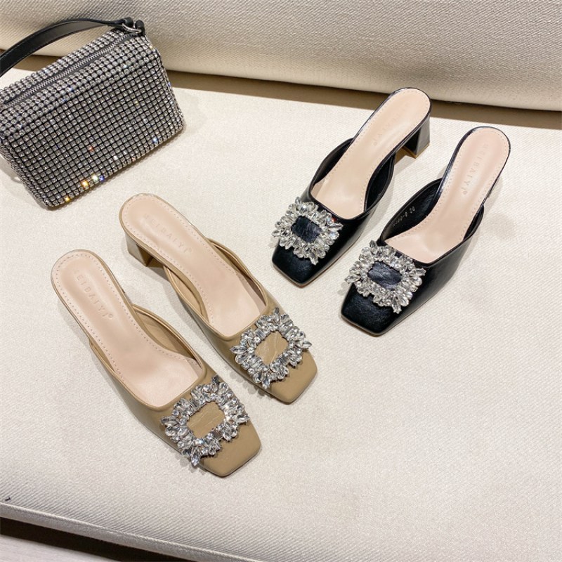 夏季新款凉拖女舒适方头高跟女拖鞋气质水钻方扣