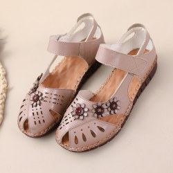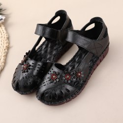 2022夏季新款头层牛皮平底女鞋民族风真皮镂空花朵女凉鞋