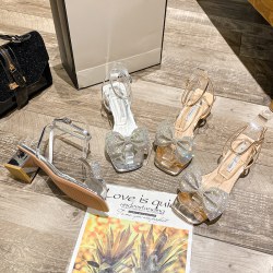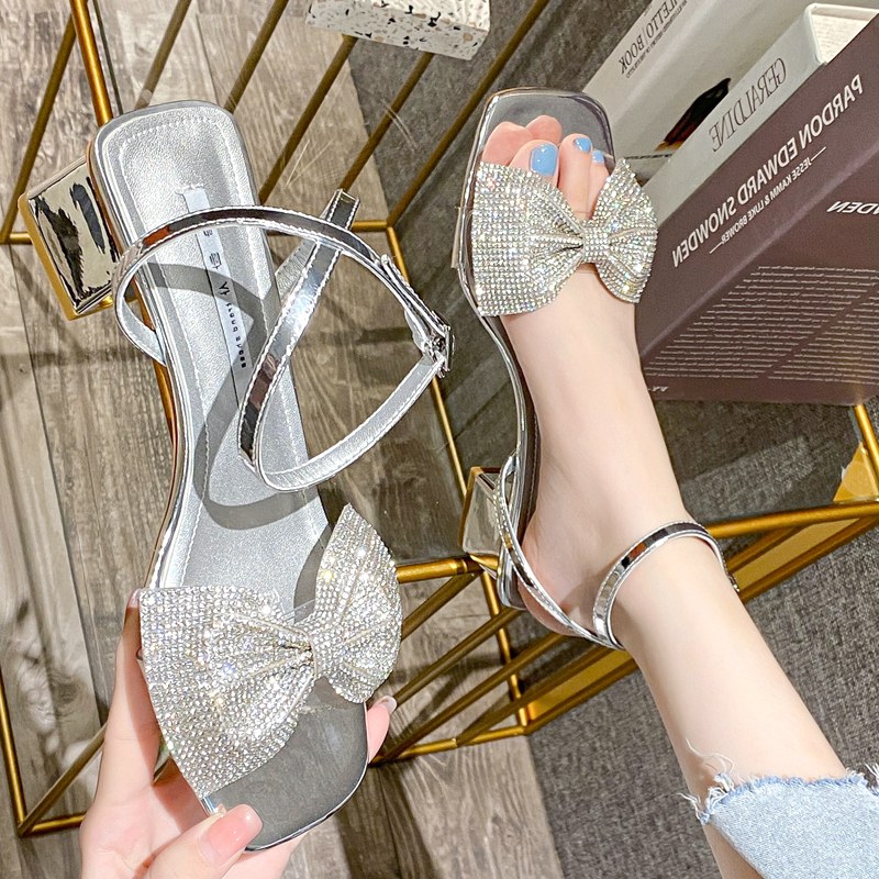 水钻蝴蝶结高跟鞋韩版仙女风一字带粗跟凉鞋女软底时尚休闲鞋