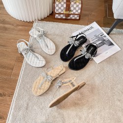 2022春夏新款仙女风水钻蝴蝶结夹趾平底凉拖鞋