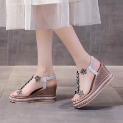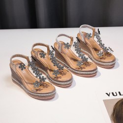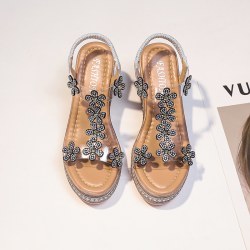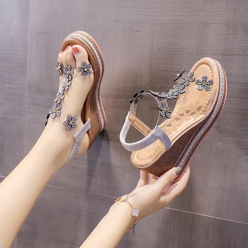 2022夏季新款坡跟凉鞋女波西米亚厚底松糕水钻花朵透明罗马鞋