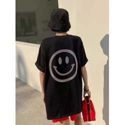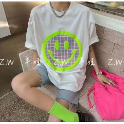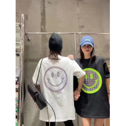 笑脸烫钻T恤女中长款2022春装新款圆领宽松短袖上衣