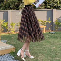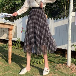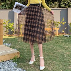 2022春夏新款网纱半身裙女高腰格子百褶裙中长款纱裙