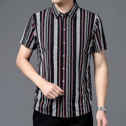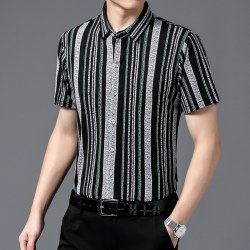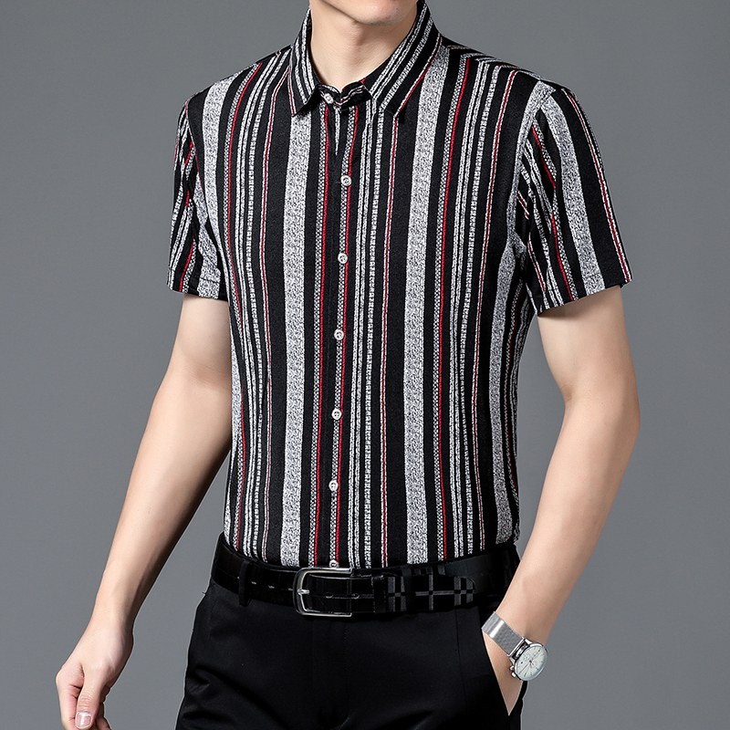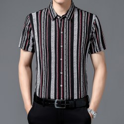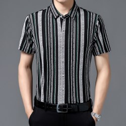 夏季新款免烫条纹衬衫男短袖男士翻领冰丝薄款中年休闲半袖