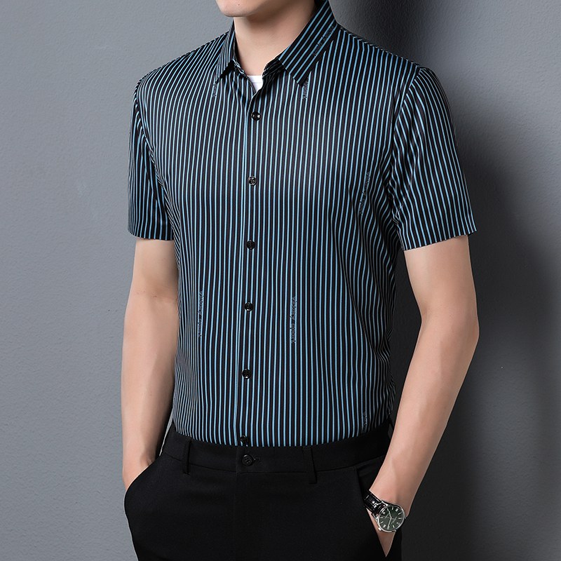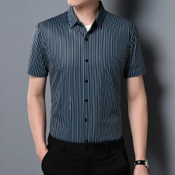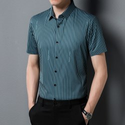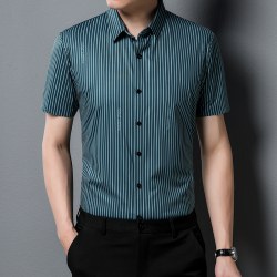 短袖衬衫男无痕压胶冰丝夏季新款翻领免烫竖条纹中年休闲