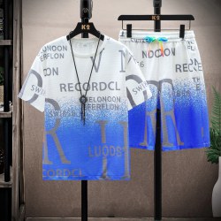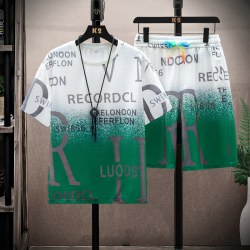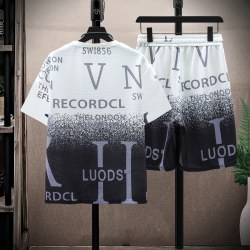 男士学生夏华夫格渐变字母印花抖音时尚T恤套装