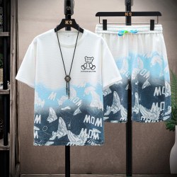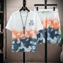 夏季华夫格印花抖音跨境快手渐变短袖T恤五分短裤套装