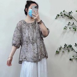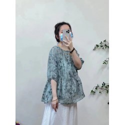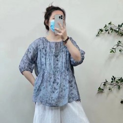 2022年夏款新款复古圆领纯苎麻碎花宽松百搭减龄娃娃衫
