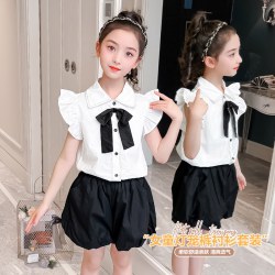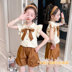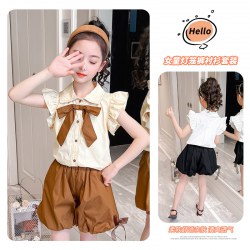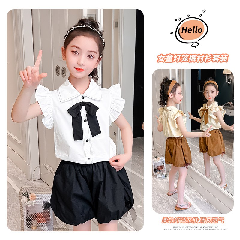 2022新款小飞袖蝴蝶结衬衫+灯笼短裤两件套