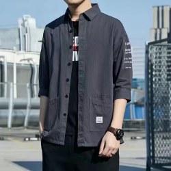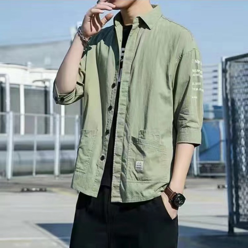 夏季纯棉七分袖衬衫男士港风休闲工装全棉衬衣青年外套