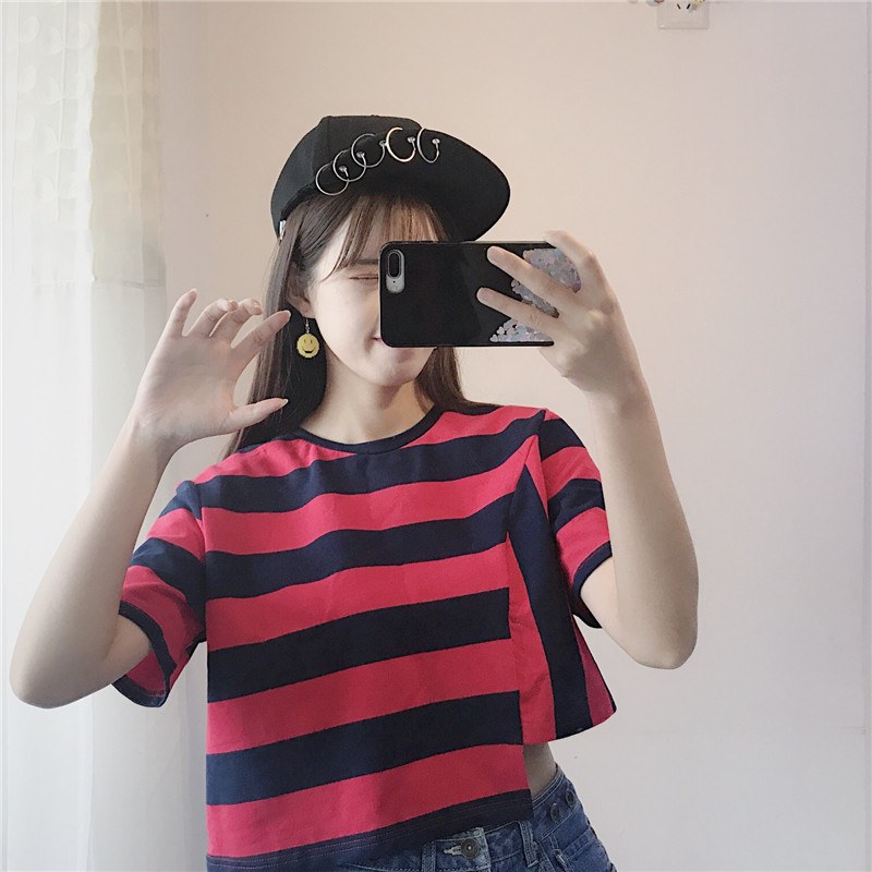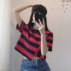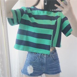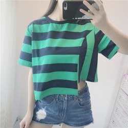2022夏装圆领宽松条纹T恤女短袖韩版原宿风短款不规则上衣