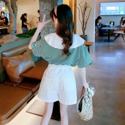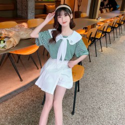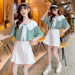 童装韩版女童套装2022夏款休闲中大童条纹海军领裙裤两件套