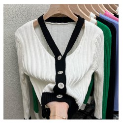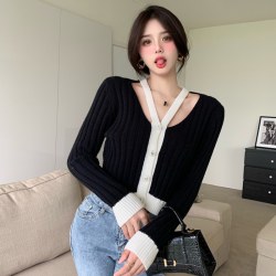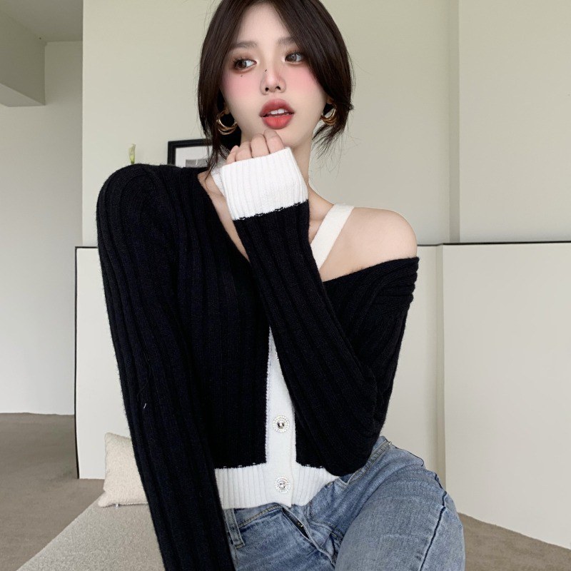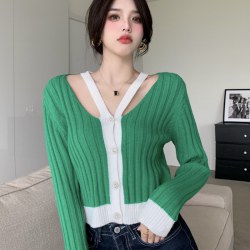 韩版2022春秋新款气质镂空针织开衫女短款撞色毛衣慵懒风女装