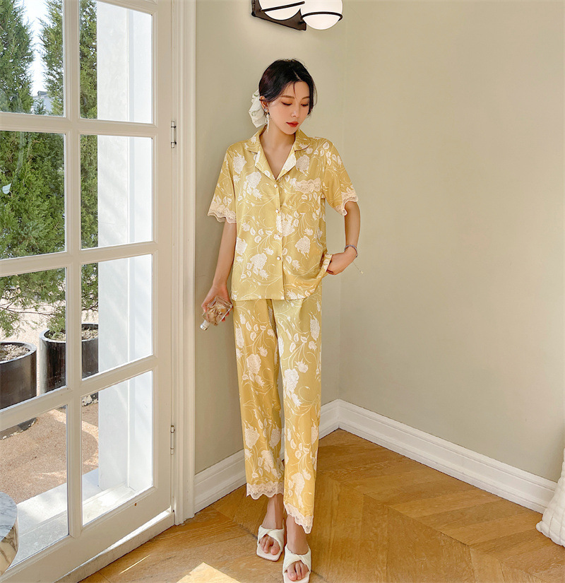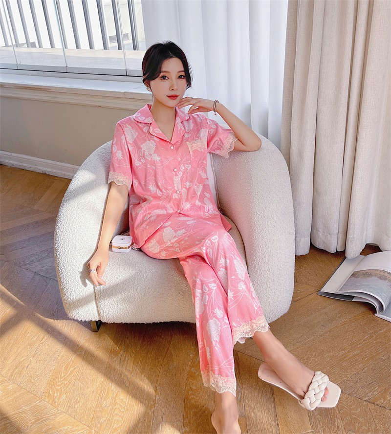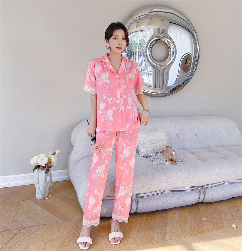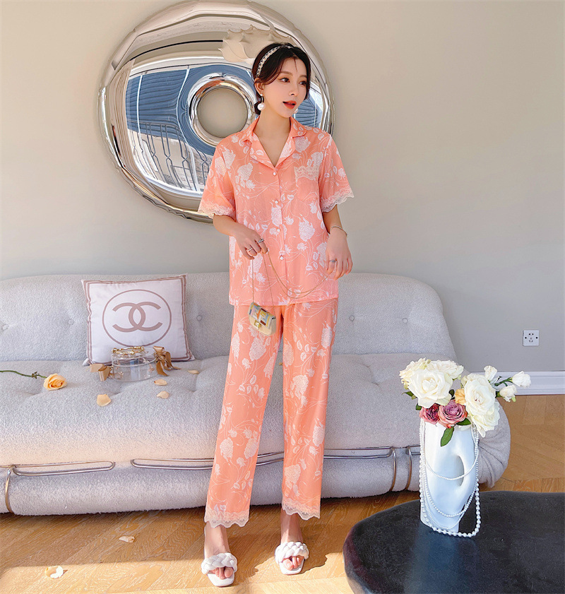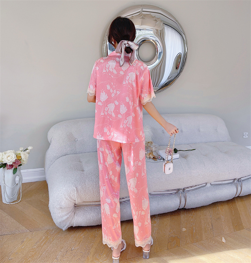 冰丝睡衣女春夏季短袖开衫洋气印花套装可外穿网红直播款家居服夏