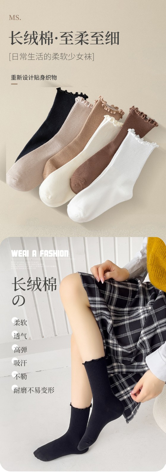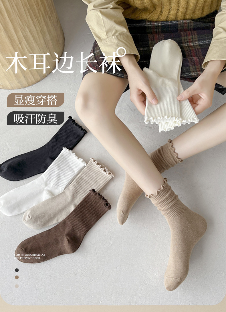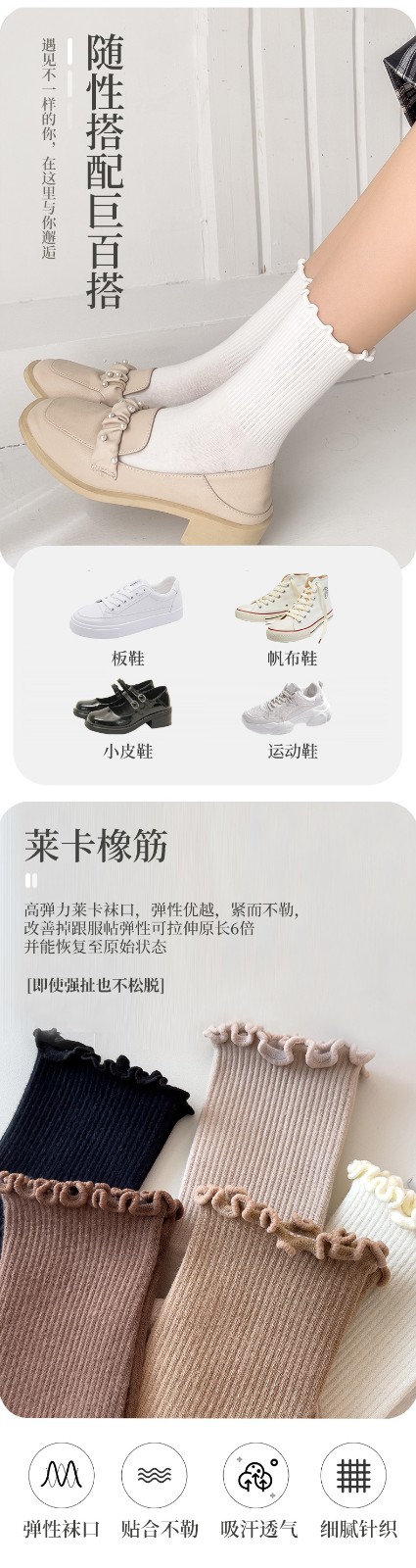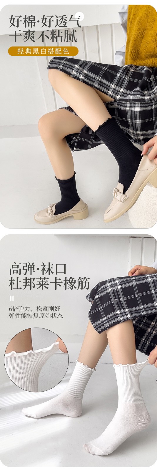秋冬木耳边袜子女白色纯色中筒袜潮花边百搭棉袜堆堆袜诸暨日系风