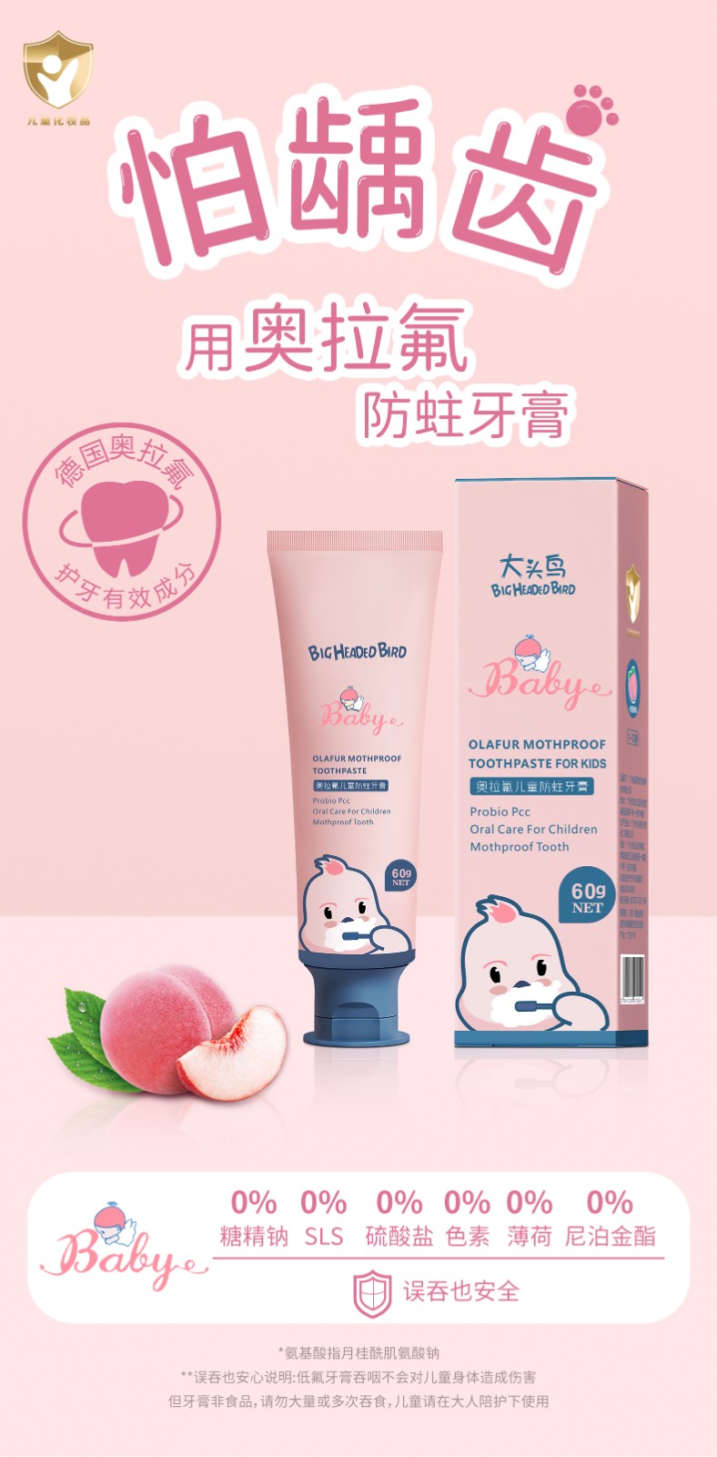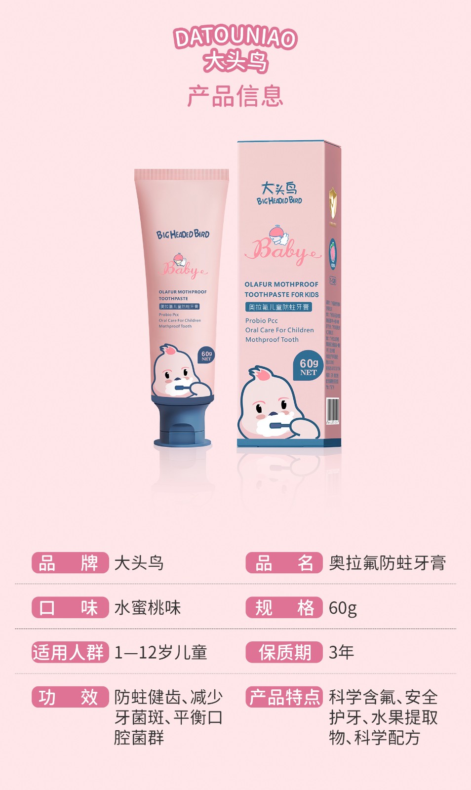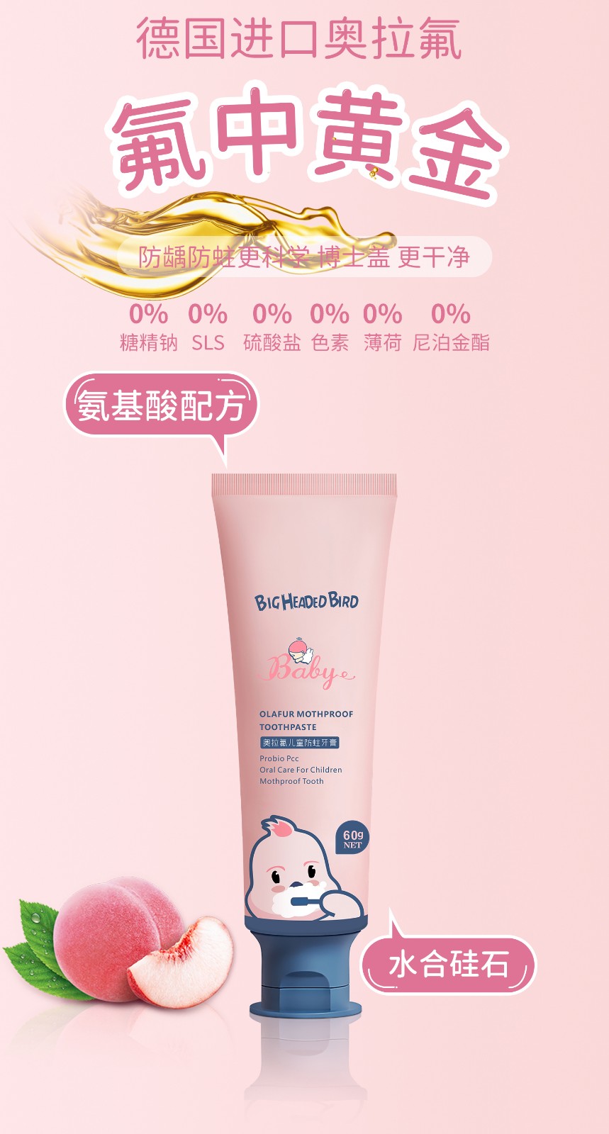 大头鸟婴幼儿奥拉氟儿童牙膏清洁健齿蜜桃味中大童牙膏正品